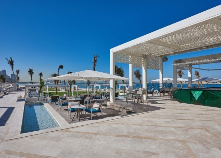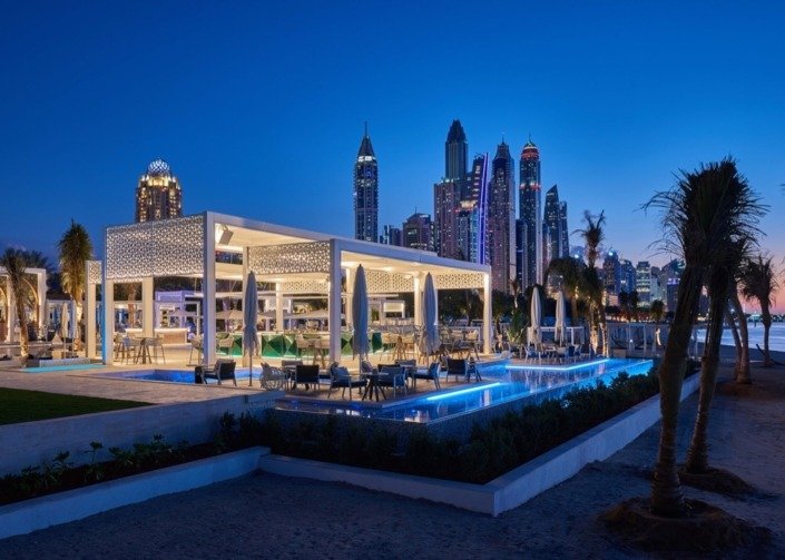 Private beach club with a stunning infinity pool, overlooking one kilometre of prime beachfront and lush landscaped surroundings offering panoramic views of Palm Island Bay and Dubai’s iconic skyline.